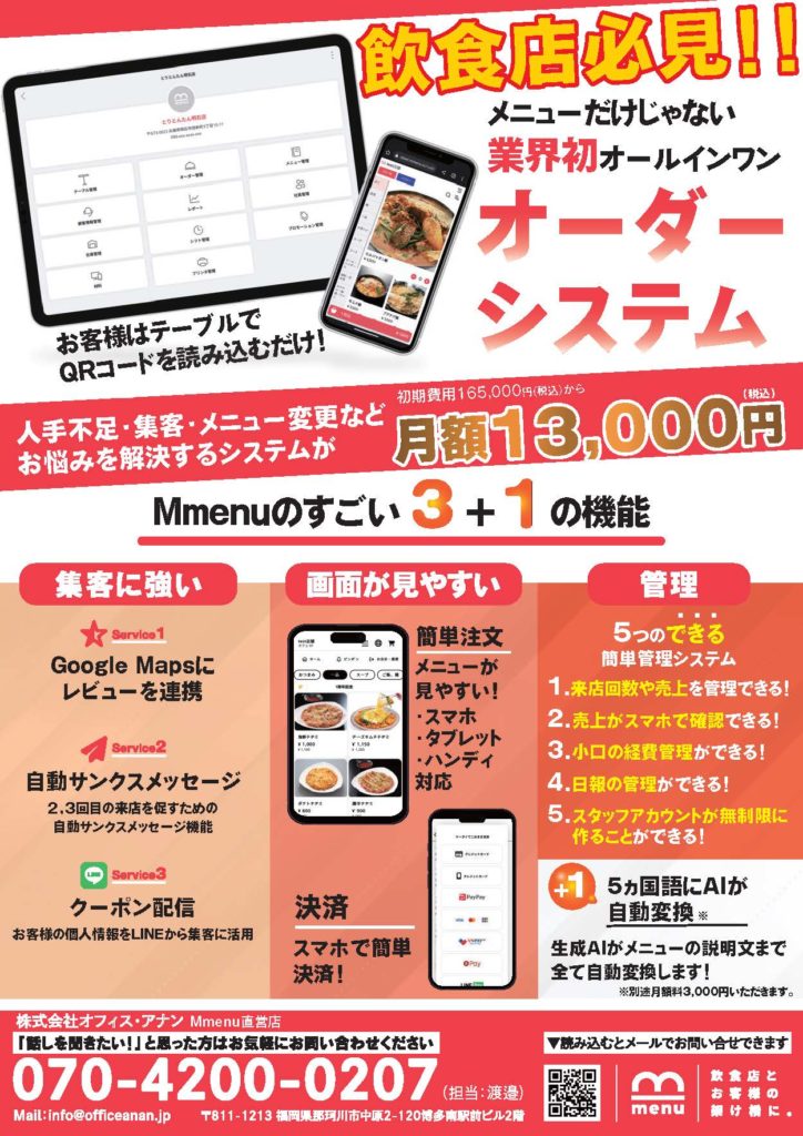 飲食店の「困った」を解決する最強の武器、Mmenuの導入を全力でバックアップします。